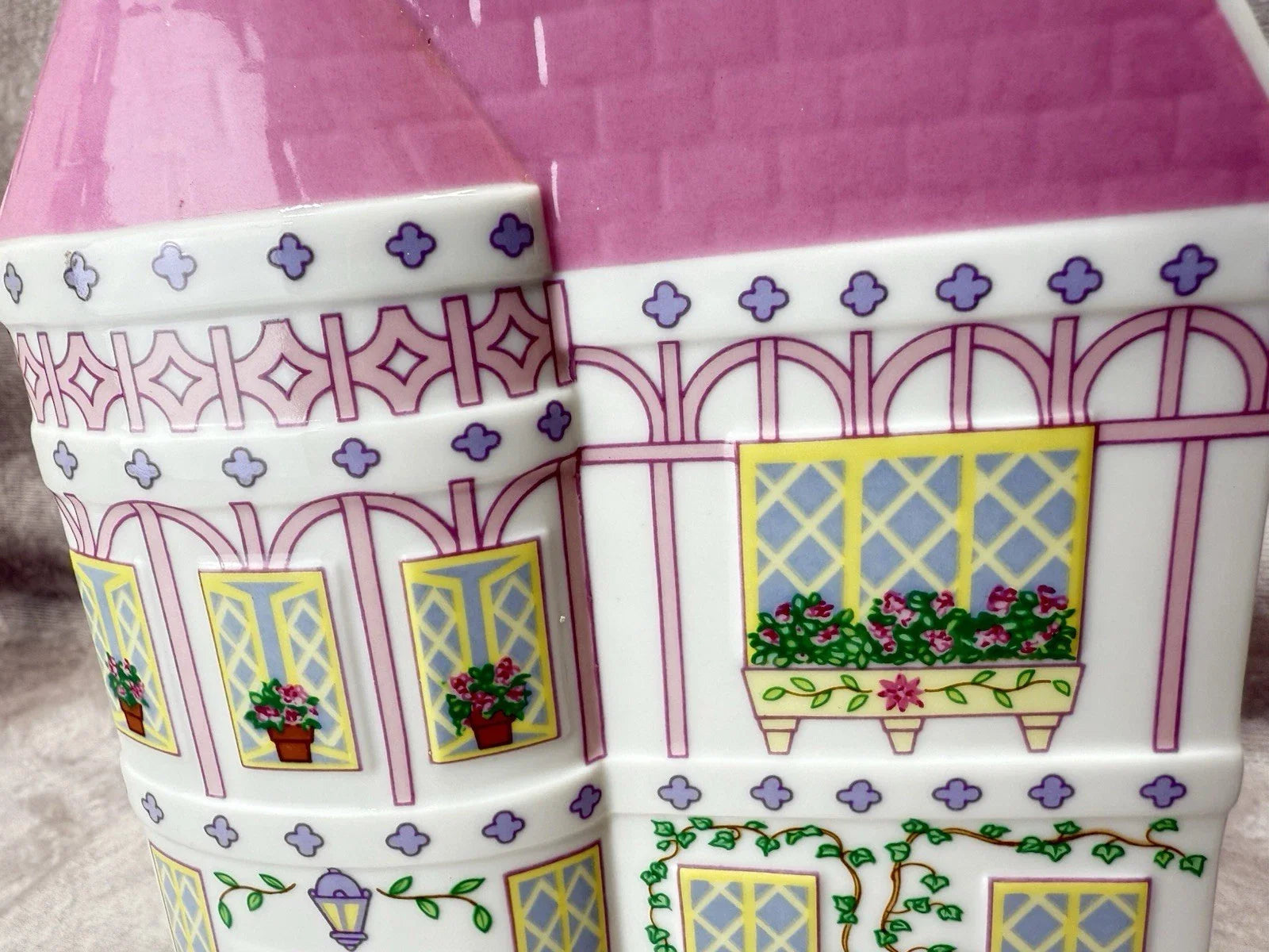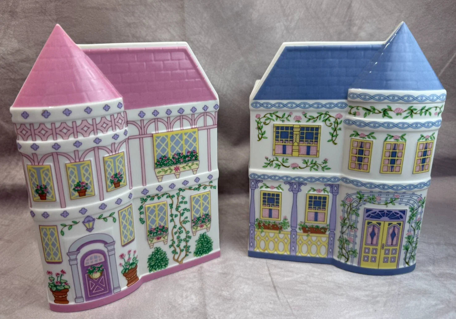 Beautiful and rare 1993 LENOX SPICE VILLAGE Planters Set, featuring a hand-decorated pink turret building and a matching blue turret building. Crafted in fine glazed porcelain, these planters bear the Lenox trademark in 24-karat gold and are part of the beloved Spice Village collection.