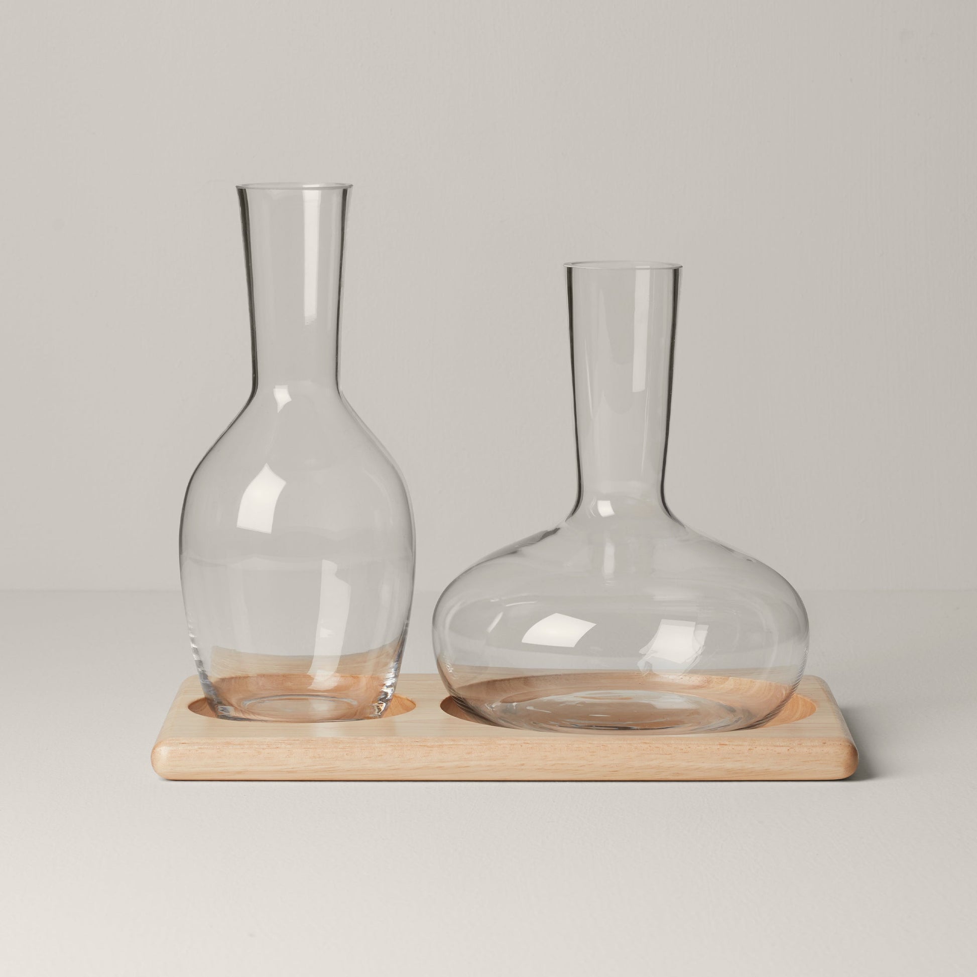Bring an innovative, elegant look to every event with the perfect set for aerating and elevating all your refreshments. This Tuscany Classics carafe set features a wide and tall carafe hosted atop a stylish wooden tray. Both carafes are crafted of durable, pristine glass and dishwasher-safe for added convenience.
